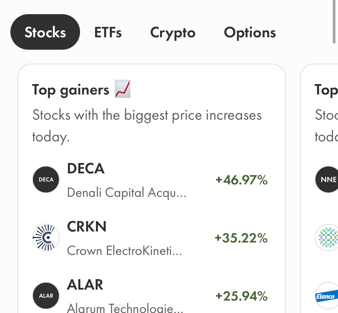 스톡, ETFs, 크립토 등 원하는 분야를 골라서 쉽게 파악 가능하고 계좌 별도 오픈 시 미국 주식도 도전할 수 있다.