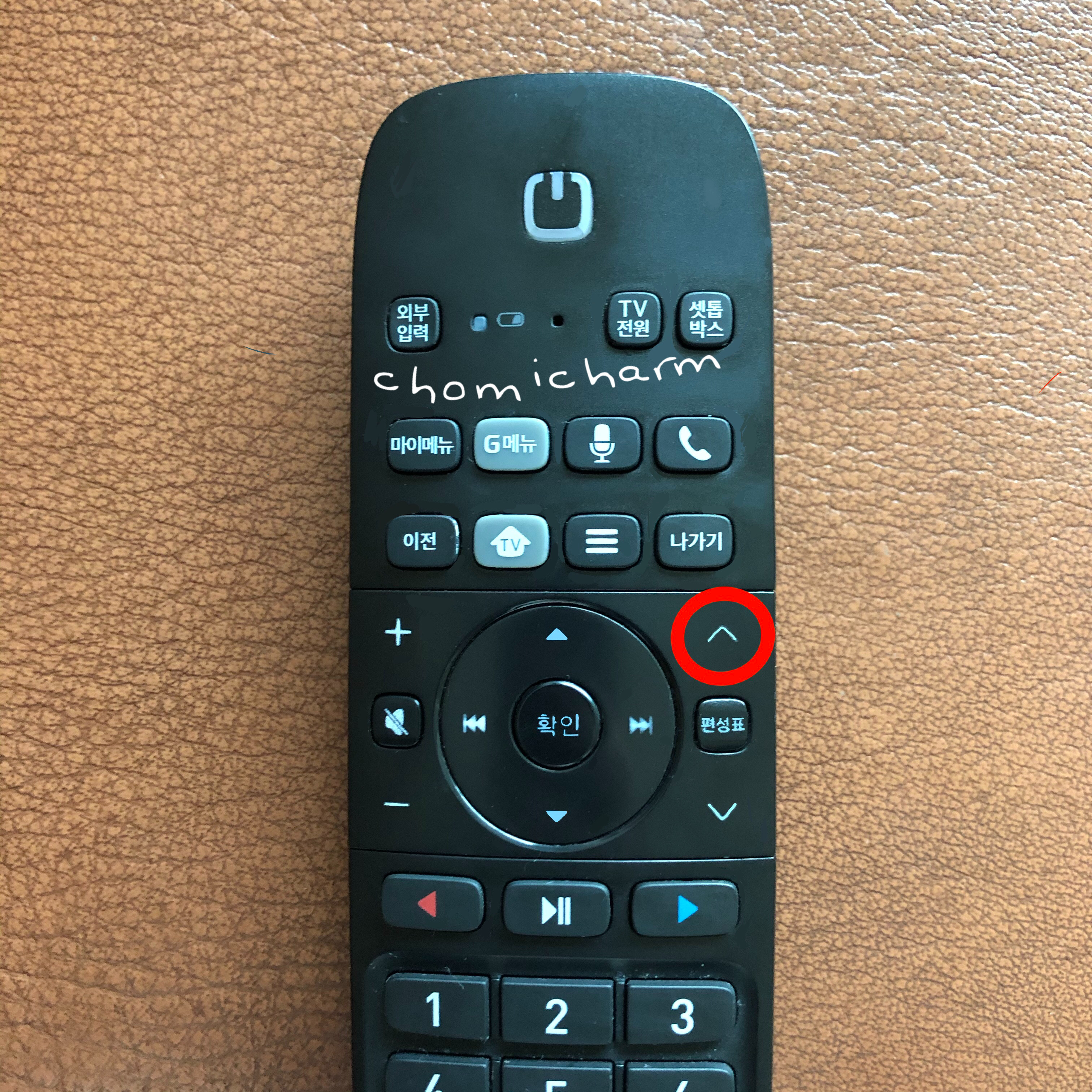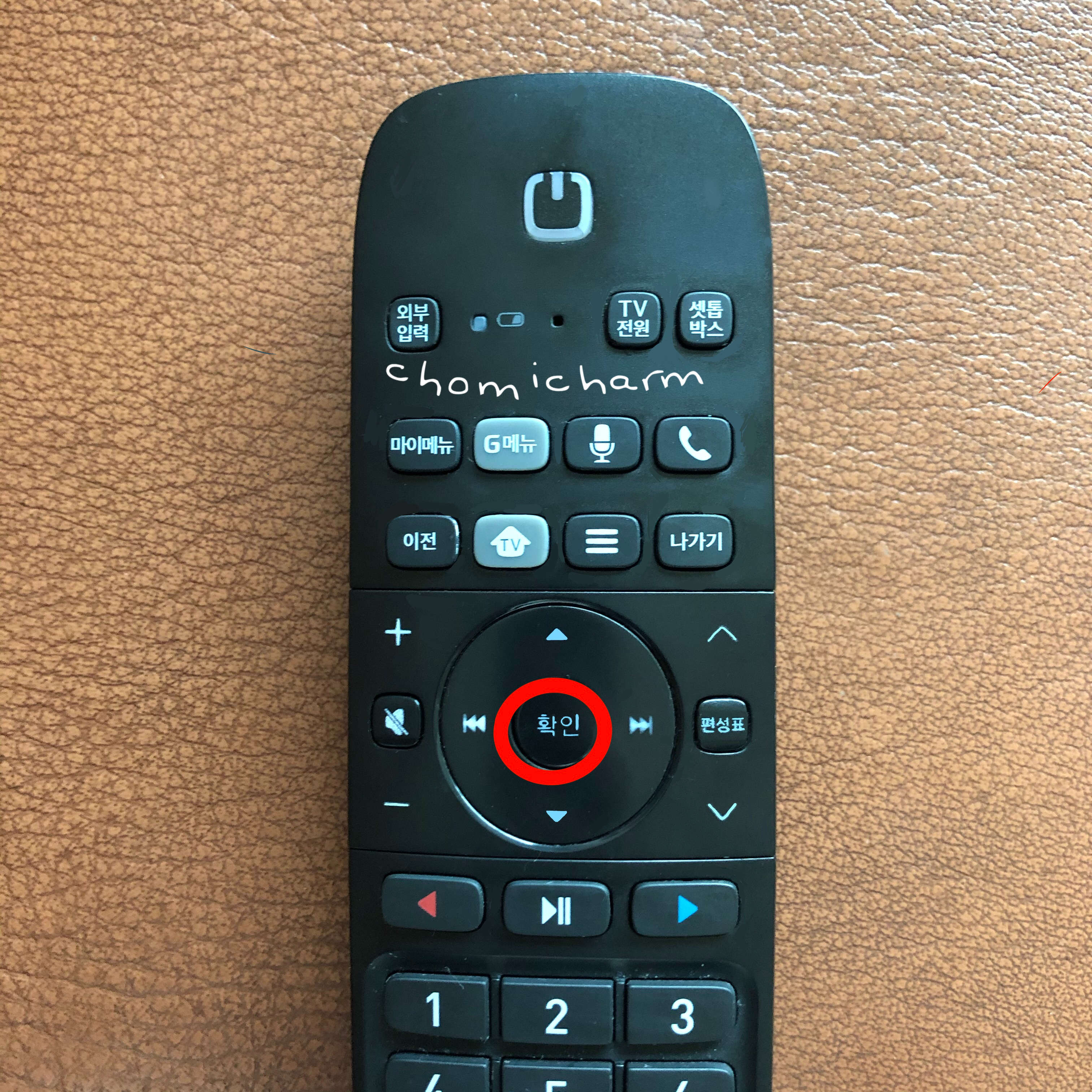 1). 리모컨의 머리를 셋톱박스를 향하게 두고 집모양 아이콘이 그려진 TV버튼 + 확인버튼 동시에 3초 이상 누른다.