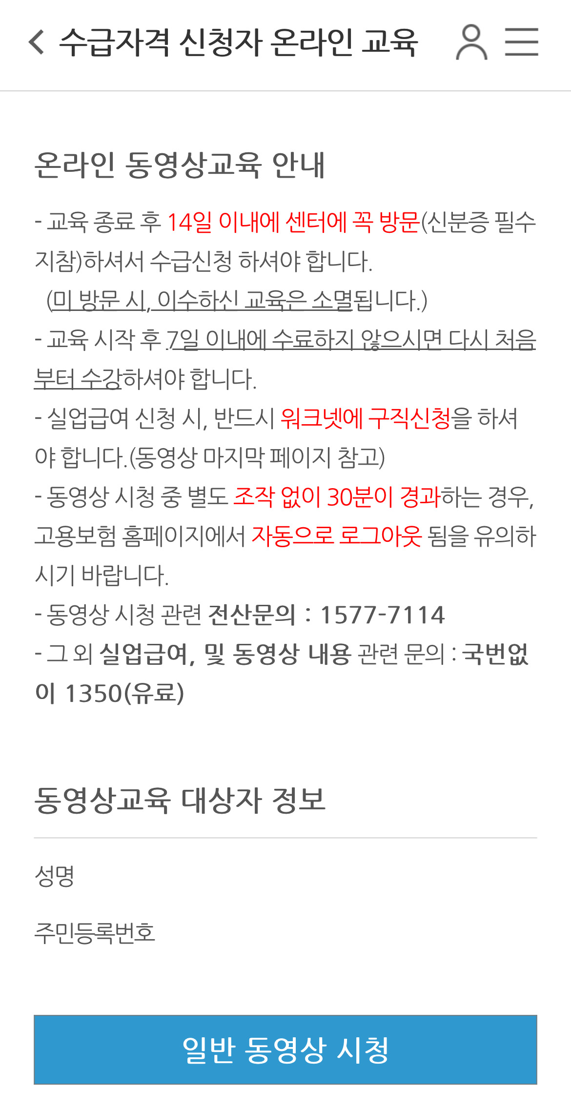 고용보험 홈페이지에 접속해서 수급 자격 신청자 온라인 교육을 수강해야 된다. 만일 미리 듣지 않을 경우 따로 시간을 내서 고용센터에서 들어야 하기 때문에 미리 듣고 가는 것이 시간 절약도 되고 좋다.