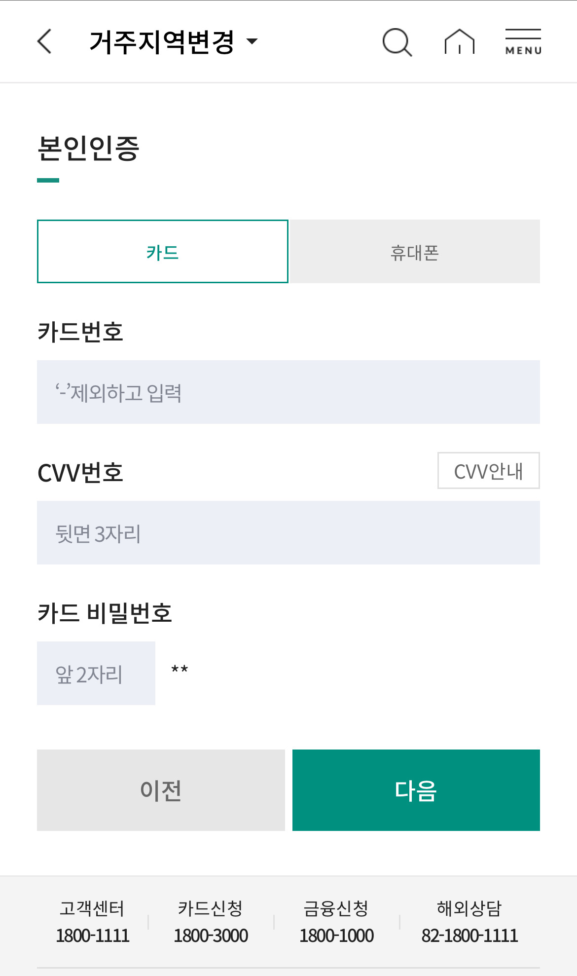 하나카드 홈페이지에 접속 후 거주지역변경을 누른다.