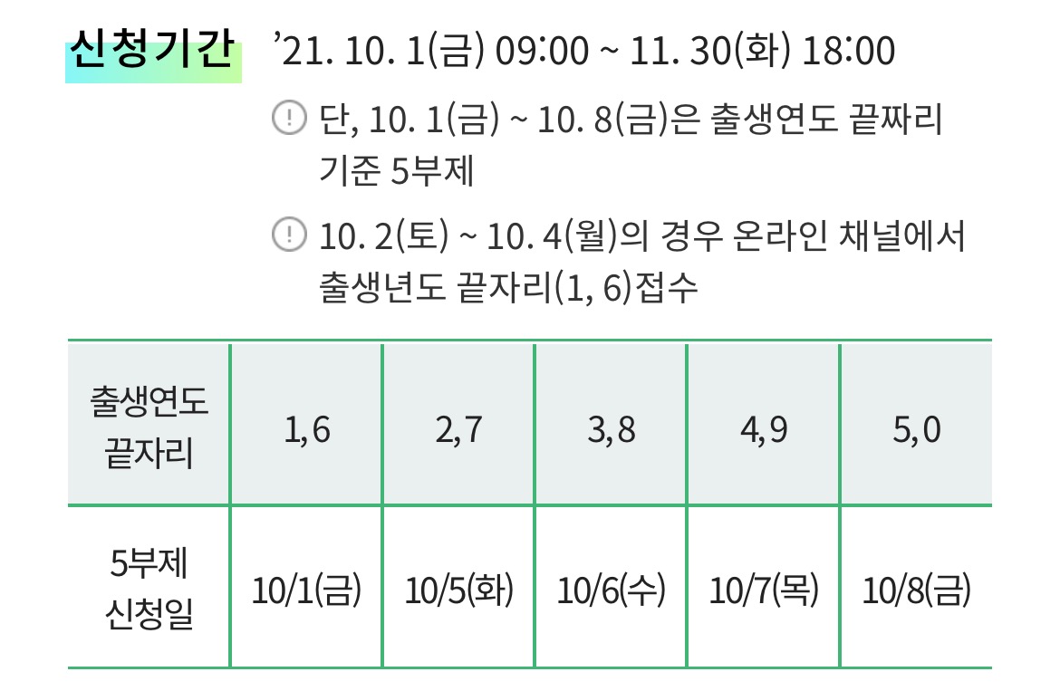**신청은 출생연도 끝자리 5부제를 기준으로 하고 있기 때문에 본인의 출생연도 끝자리와 신청일을 잘 확인해야 한다.