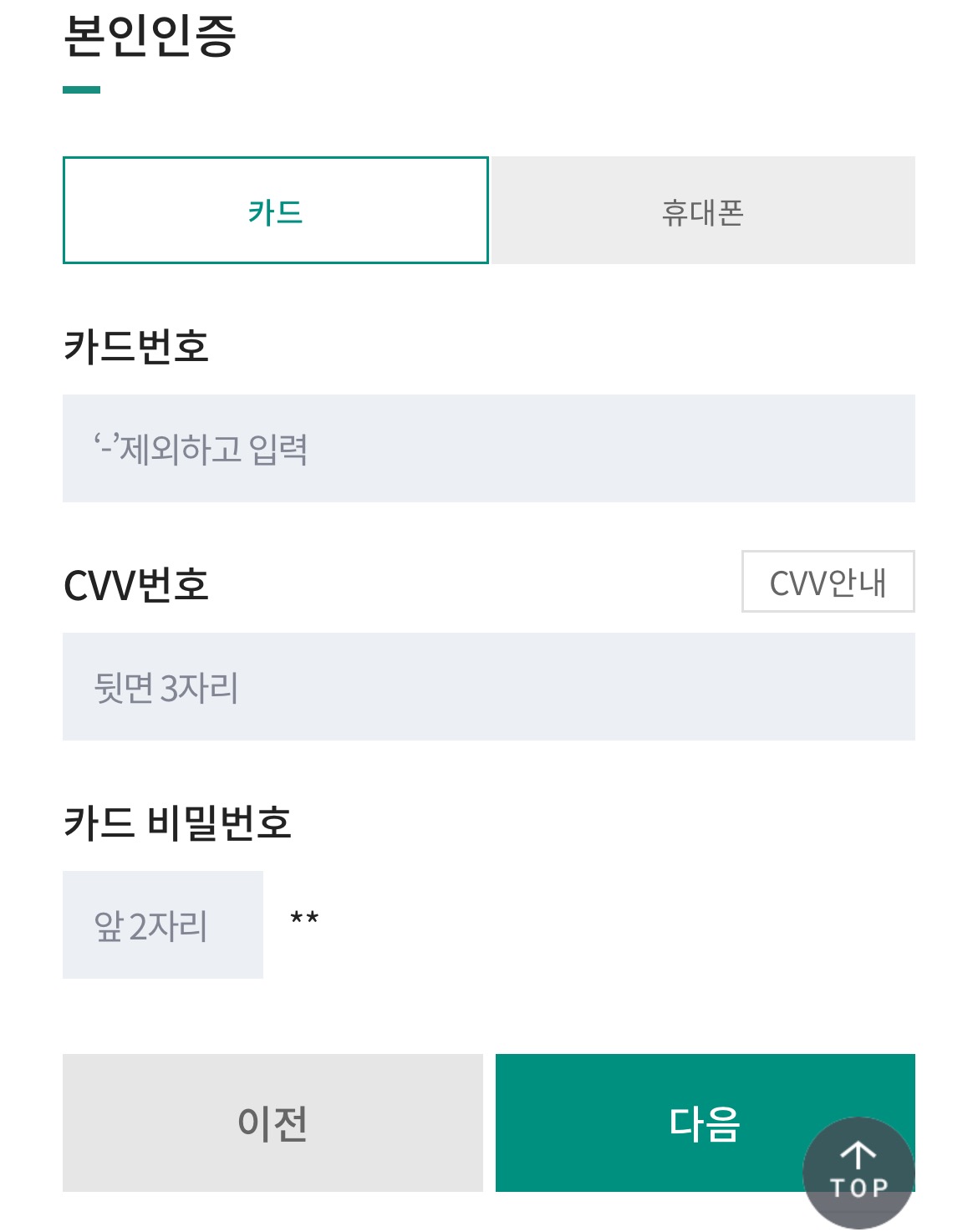카드나 휴대폰 번호를 입력해서 본인인증을 한다.
