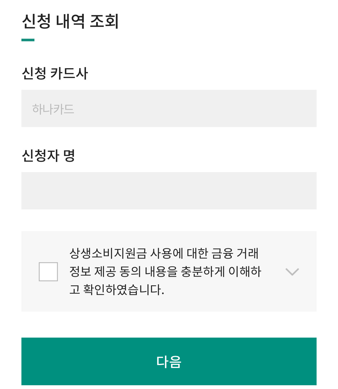 신청 카드사와 신청자 명이 맞는지 확인 후, 먼저 동의를 누르고 다음을 누른다.