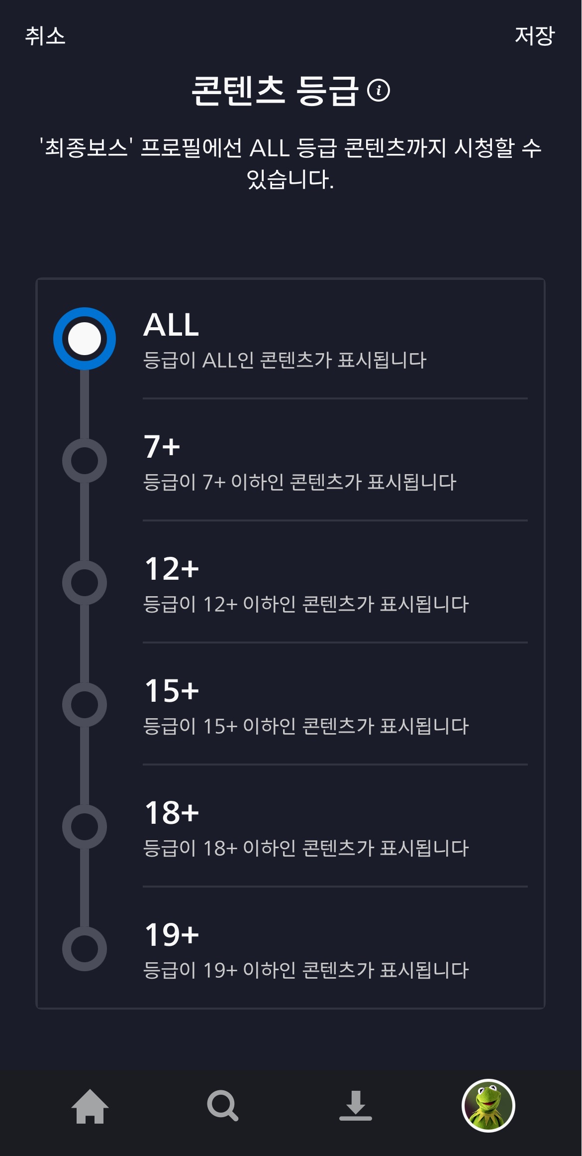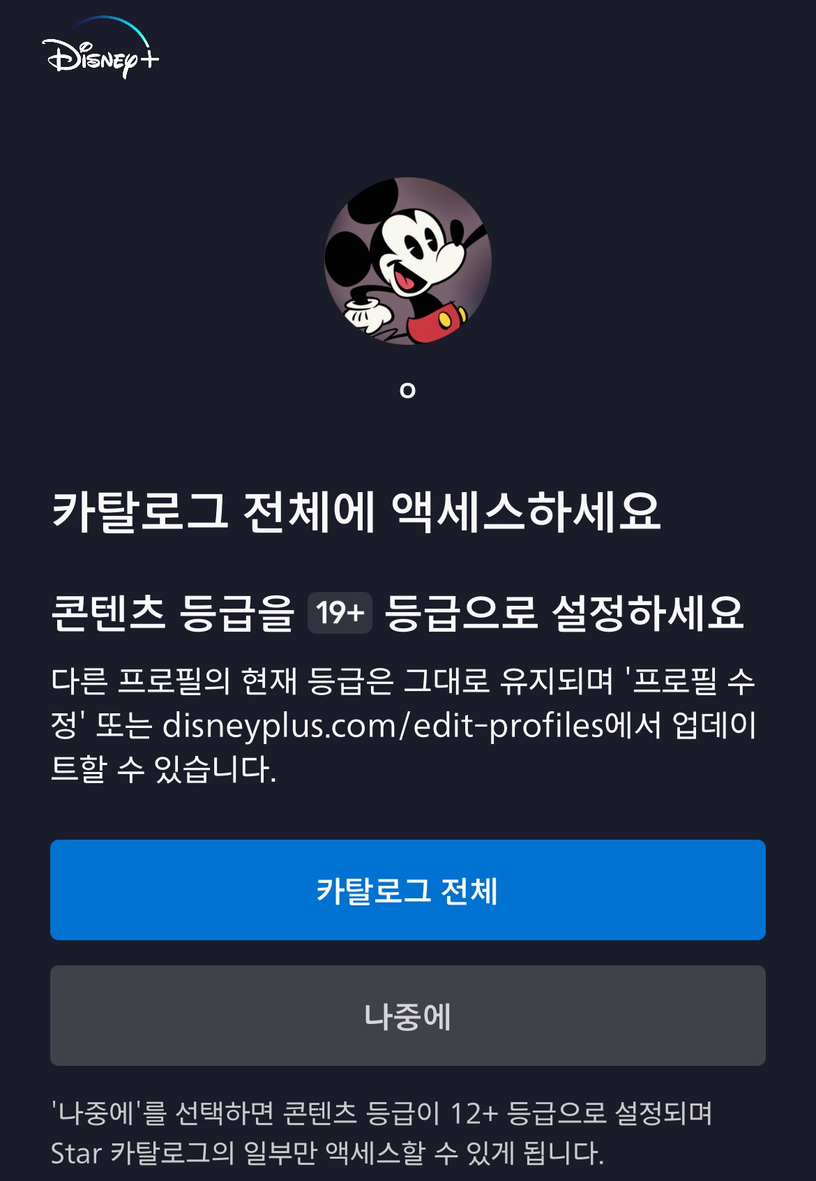 등급은 7세 이상에서 19세 이상까지 있으며 19세 이상을 설정하면 디즈니 플러스에 있는 모든 영상 시청이 가능해진다.