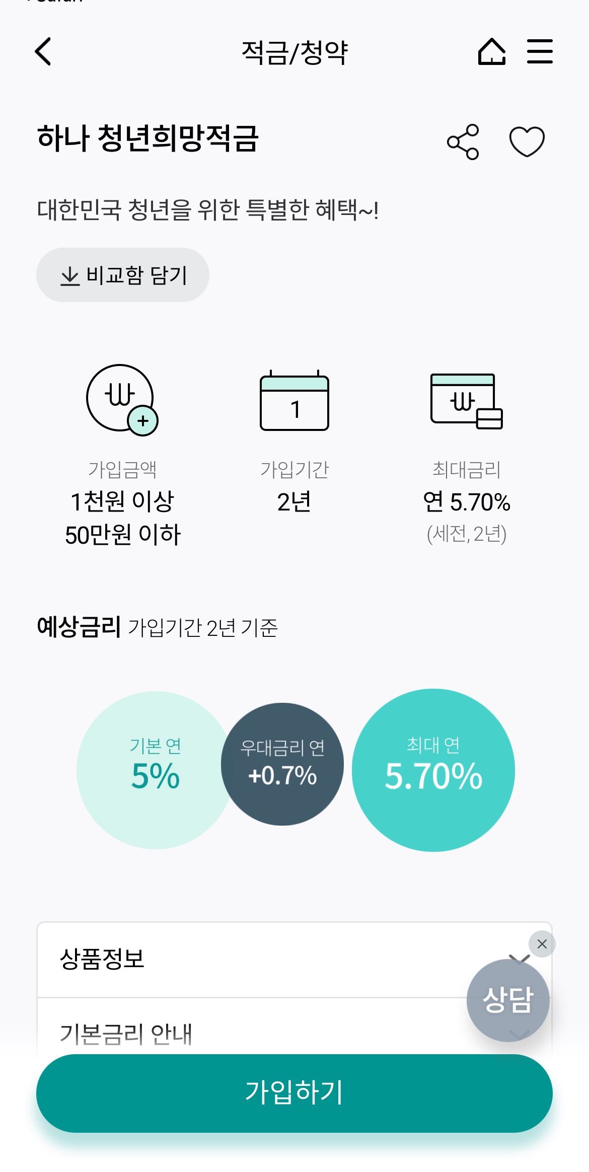 2. 하나 청년희망적금 페이지에서 가입하기를 누른다.