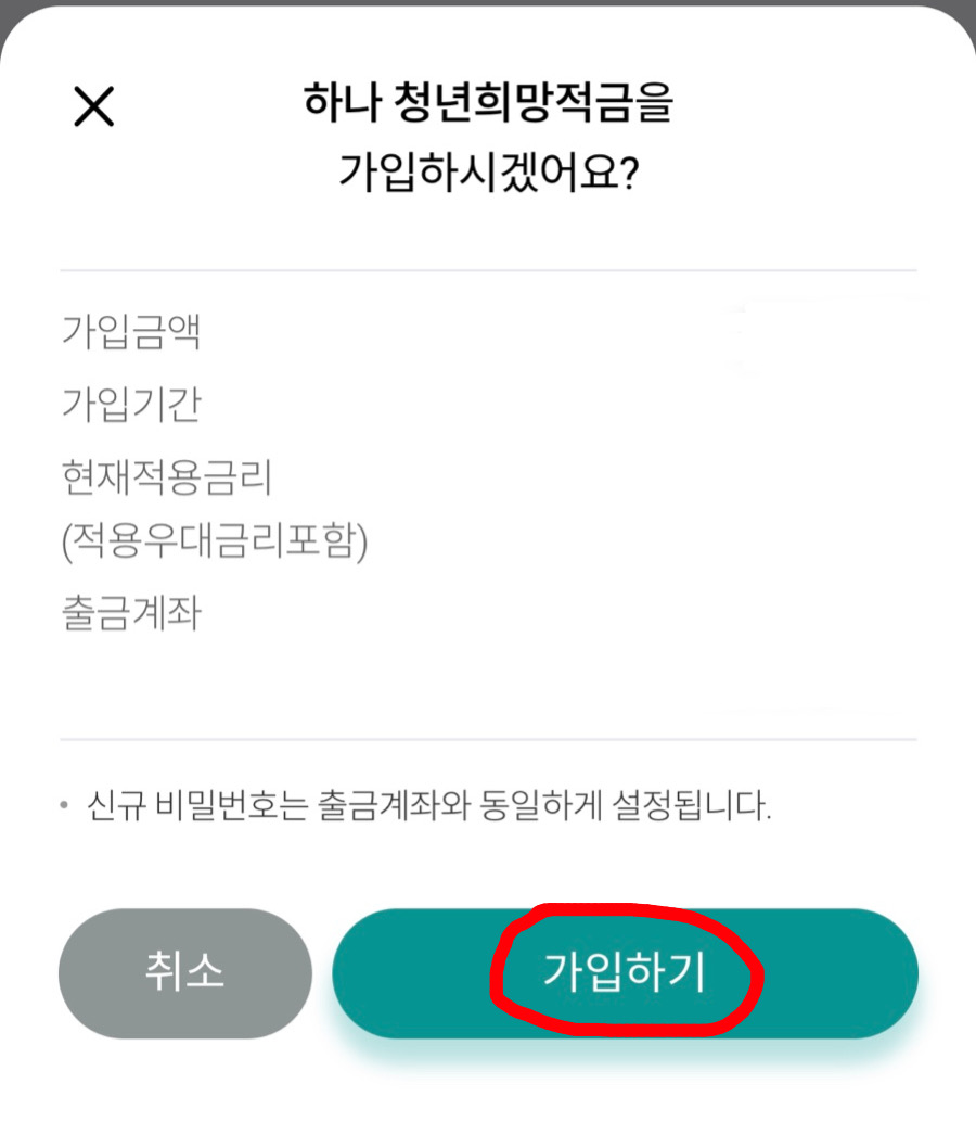 6. 가입금액, 가입기간, 현재적용금리, 출금계좌 확인 후 가입하기 누르기