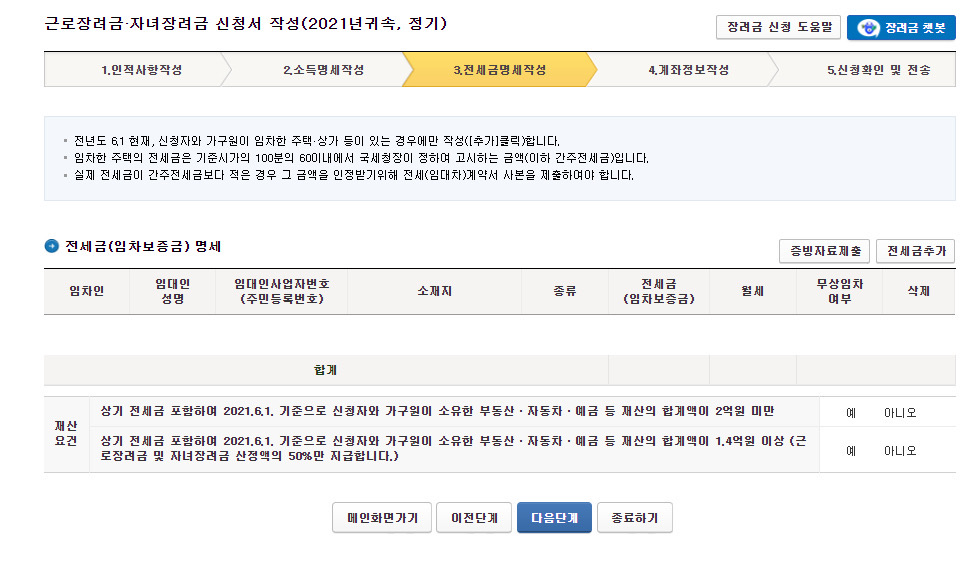 재산요건의 내용을 확인하고 해당 내용에 예, 아니오를 클릭한다.