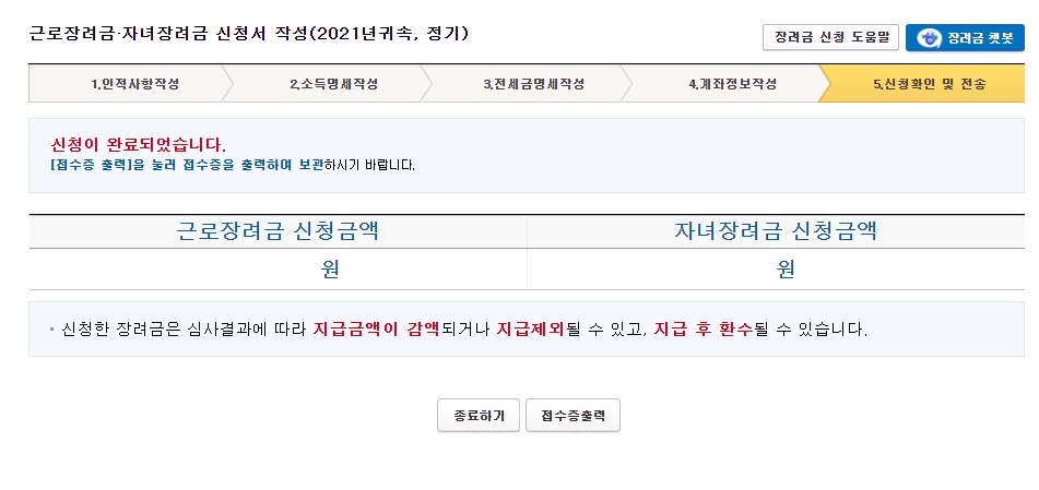 8. 수령방법과 근로장려금을 수령받을 계좌정보를 입력하고 '위 내용을 모두 확인하였습니다.'를 누르고 신청한다.