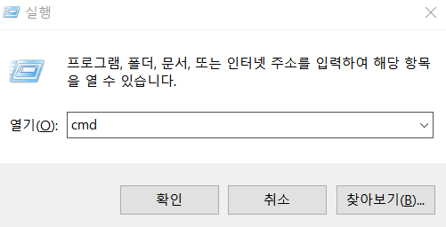 1. windows + R 키 눌러서 실행 열고 cmd 입력해서 열기
