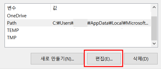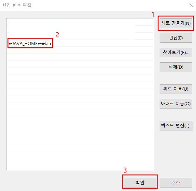 - 새로 만들기를 누른 다음, %JAVA_HOME%\bin 입력하고 확인 누르기