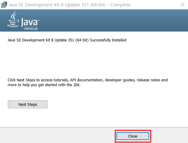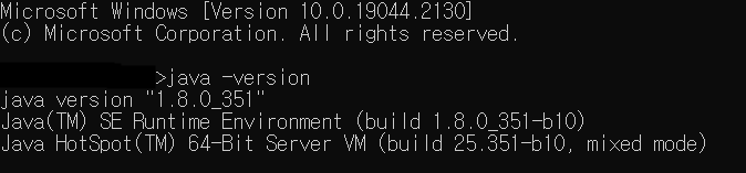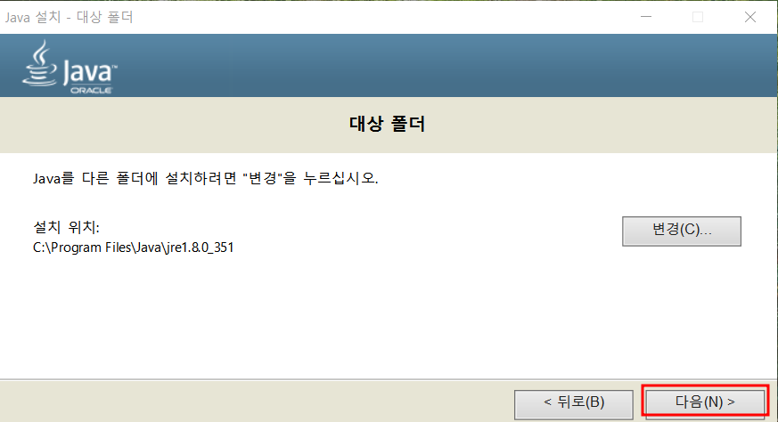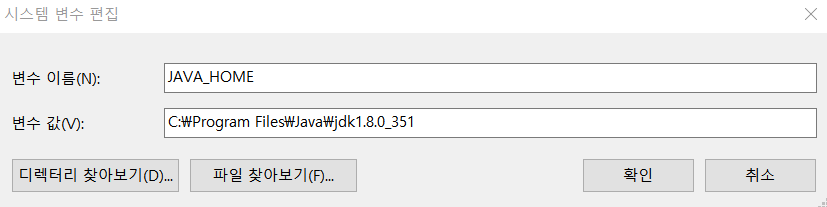 - 변수 값은 자바 설치 경로이며 설치할 때 위치를 변경하지 않았다면 위와 같은 경로가 뜸 (업데이트에 따라 끝에 숫자(351)이 달라질 수 있으므로 별도의 확인 필요)