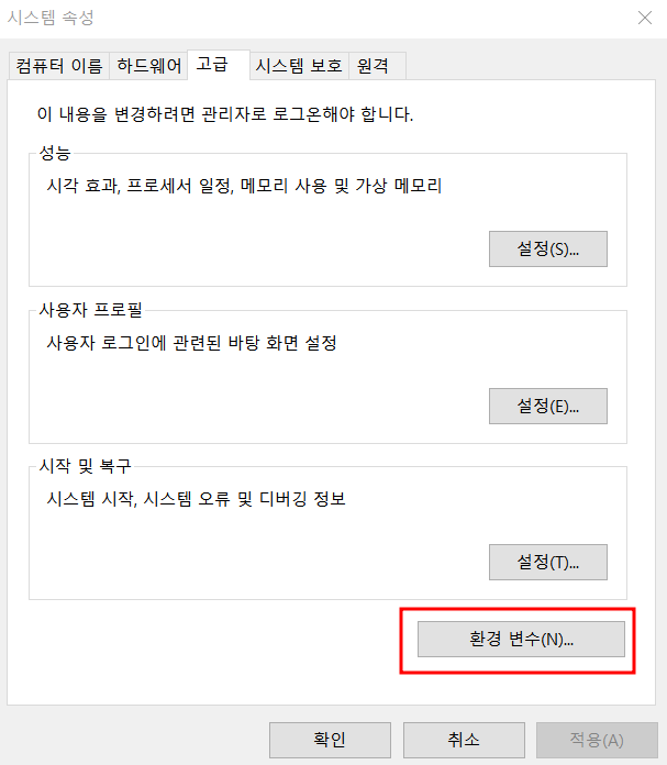 1. 고급 시스템 설정에서 환경 변수 클릭하기