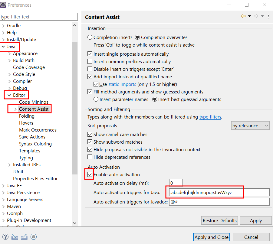windows -> preferences -> java -> editor -> content assist -> auto activation 체크 확인하기 -> auto activation triggers for java에서 .이랑 알파벳 전체 작성하고 Apply and close 누르기