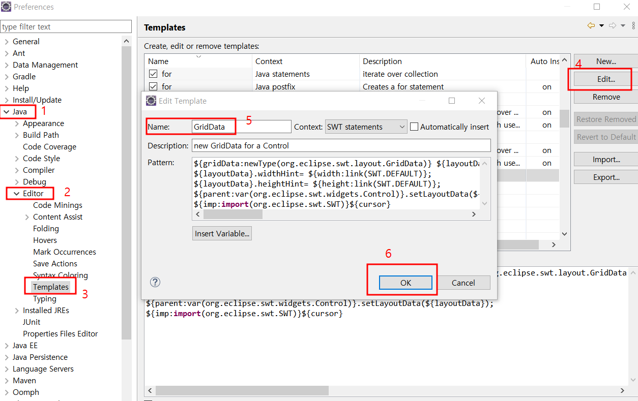 windows -> preferences -> java -> editor -> templates