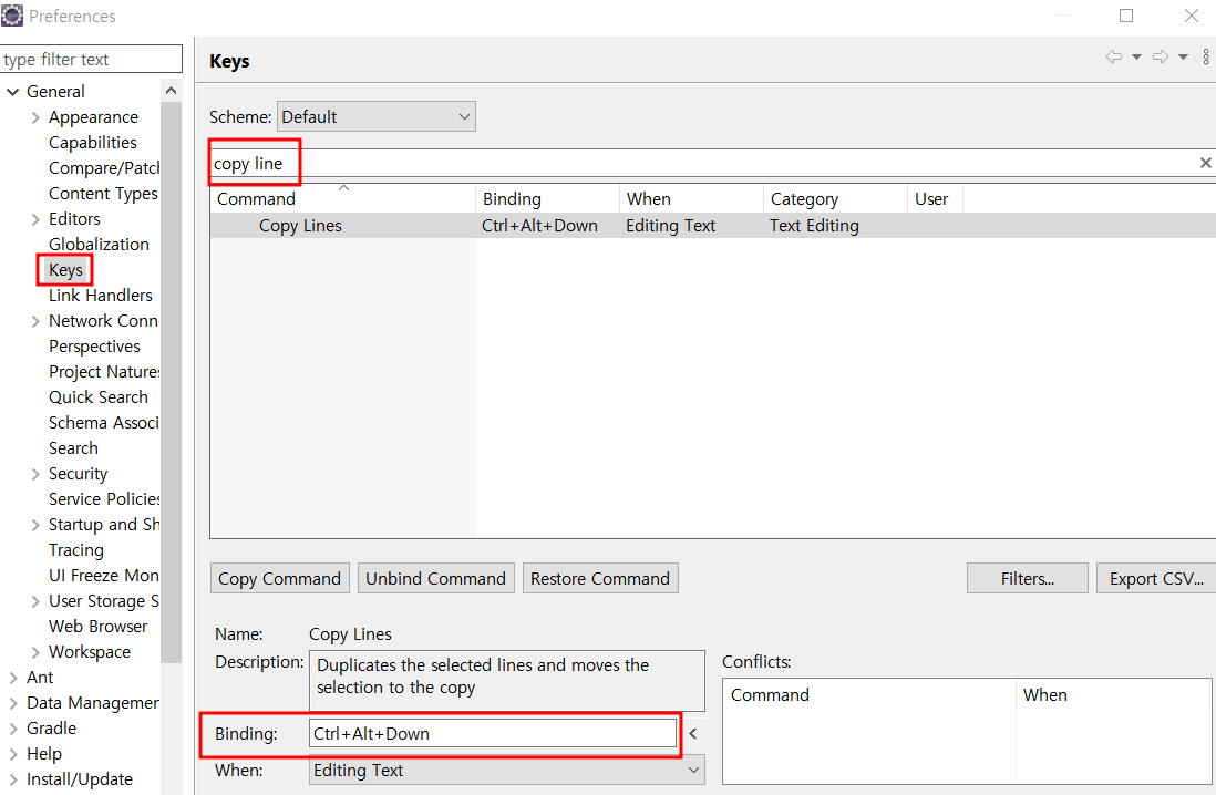 - windows -> preferences - > general -> keys -> binding 에서 단축키 변경 가능