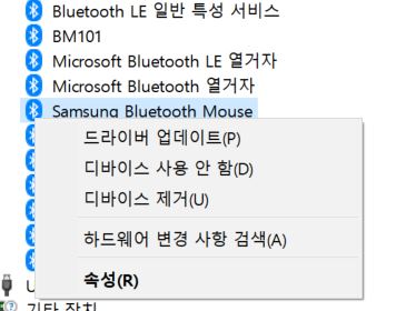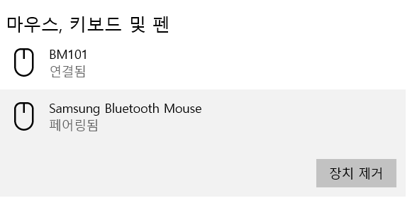 사용하는 마우스 이름에 커서를 대고 오른쪽을 눌러서 디바이스 제거를 클릭하면 연결 제거가 된다.