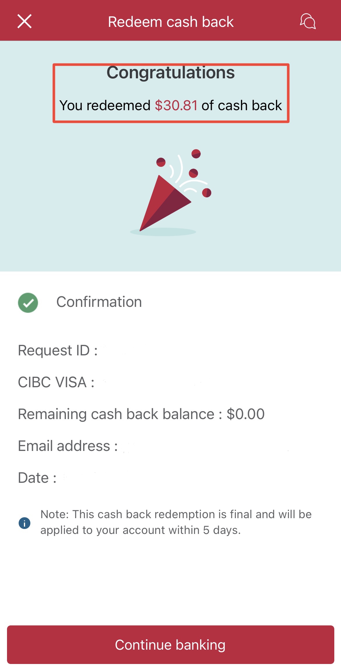 4. Congratulations가 뜨면 캐시백 신청 완료. 캐시백은 영업일 5일 이내에 크레딧카드 transactions에서 확인할 수 있다.