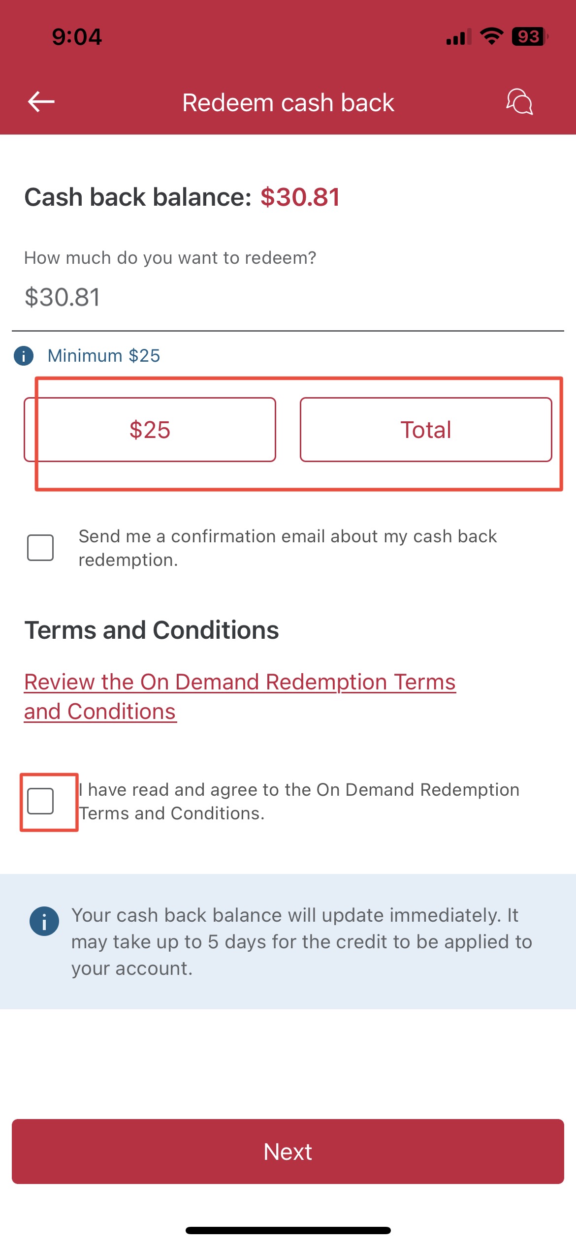 2. 캐시백 받을 금액($25 이상이나 total) 입력하고 체크박스 체크하기
